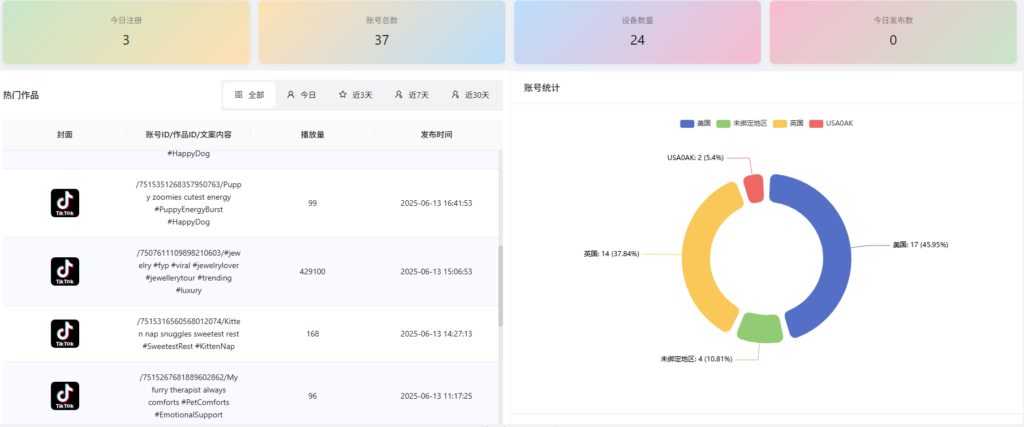 Tiktok矩阵管理系统专业级人工智能驱动的TikTok账号自动化批量管理平台,实现多账号矩阵式管理与全自动批量化运营,让您的TikTok业务轻松扩展操作手册 tiktok账户总数 功能亮点 自动批量登录注册 自动发布作品 直播监控